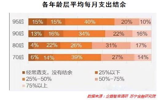 值得关注的是,显著异于其他年龄层的成长环境以及与互联网用户群的高重合度,使90后比70后、80后更敢于超前消费。参见下图: