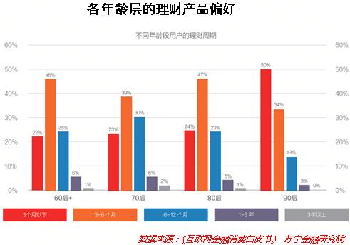 在信贷消费支持之外,90后在理财产品周期需求方面也异于其他群体。90闲置资金较少,对资金的流动性需求较高,因此更偏向超短期的理财产品。80后与70后、60后对理财产品周期的需求较一致,追求期限在3-6月之间的理财产品。