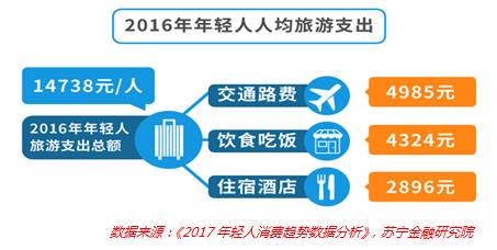 除了去标签化的产品,他们还偏好享受,比如旅游产品就是一类典型的备受90后追捧的享受类产品,旅游支出在90后人群的消费总支出中占有越来越明显的一席之地。2016年年轻人人均旅游支出调查数据显示,2016年年轻人人均旅游支出总额达到14738元(如下图)。