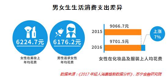 比较有趣的是,不同于70后、80后在美妆消费上的大相径庭,90后男女在美妆上的花费差异不大。