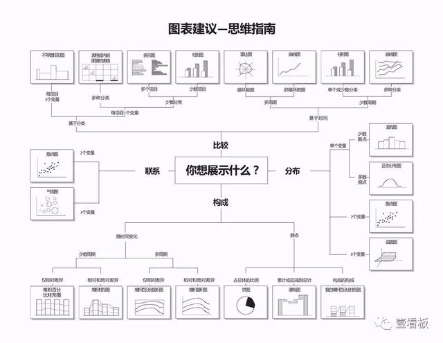 如何选择正确的图表也算是老生常谈了,壹湿兄也写过类似的文章,但还是很多小伙伴们,不求甚解问壹湿兄这个问题。 可能每次写很多类型的图表,小伙伴们不能一下熟记于心,这次我尽量用另外一种方式去解答,简单明了,且容易记住的。 现在的图表越来越偏向于炫酷、美观,这其实无可厚非,随着人们的审美标准的变化,图表的美观程度也得跟上时代。但数据可视化的核心还是在于通过数据的分析所能反应业务存在的问题,从而指导业务本身。所以选对合适的图表,直观有效的看出数据问题所在才是最必要的,选对合适的图表很关键,这就考验数据分析师的数据可视化能力了。 之前网上一张被国内外数据分析人士奉若至宝的一张思维导图广泛流传,很多人也是看到后第一时间放到收藏夹……