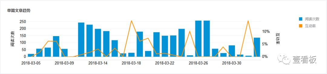 这样版面整洁、干净利落,又包含很多信息量,是很多做高端报告等常用的数据展示图表。同上,粉丝数和关注数、整体平台阅读数等也同样适用。 那么想研究文章阅读量与互动率的趋势,那么可以采用柱线图